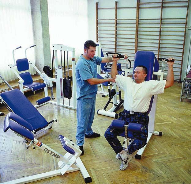 (лекары, медсёстры, фізіятэрапеўты) і сучаснае лячэбнае абсталяванне.